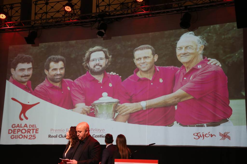 La gala del deporte Gijones otorgo al RCG de Castiello el reconocimiento a la entidad deportiva mas destacada de 2025, el presidente del RCG de Castiello Casimiro Ayesta Gonzalez recibe de manos de la vicealcaldesa Angela Pumariega la distinción premio estatua de Pelayo.