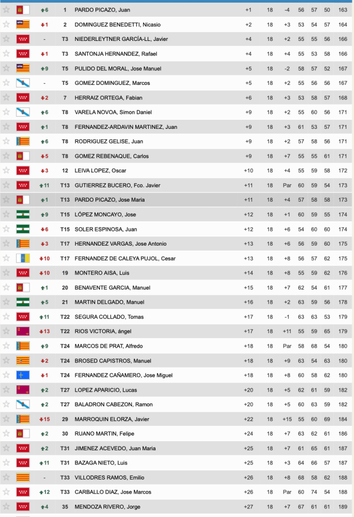 El valdesano Jose Miguel Fdez. Cañamero firmo tarjetas de 60, 58 y 62 (180) finaliza en el puesto 24º, con un total de 193 golpes Angel Viejo finaliza en el puesto 43º, Arturo Glez. Longo necesito 198 golpes para terminar en el puesto 46º, Sergio Gabán fue 49º con 204 golpes, uno más para Juan Carlos García Nicolas que acaba en el puesto 50º