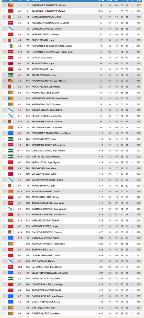 El valdesano Jose M. Fdez. Cañamero se situa en el puesto vigesimo tercero con un total de 118 golpes ( 60 – 58) , es el mejor asturiano clasificado, con 129 golpes Arturo Glez. Longo esta en el 41º, Angel Viejo Fdez. Asenjo en el 47º con 135 golpes, 137 para Juan Carlos García Nicolas en el 51º , a tan solo un golpe Sergio Gaban Rodriguez 52º,