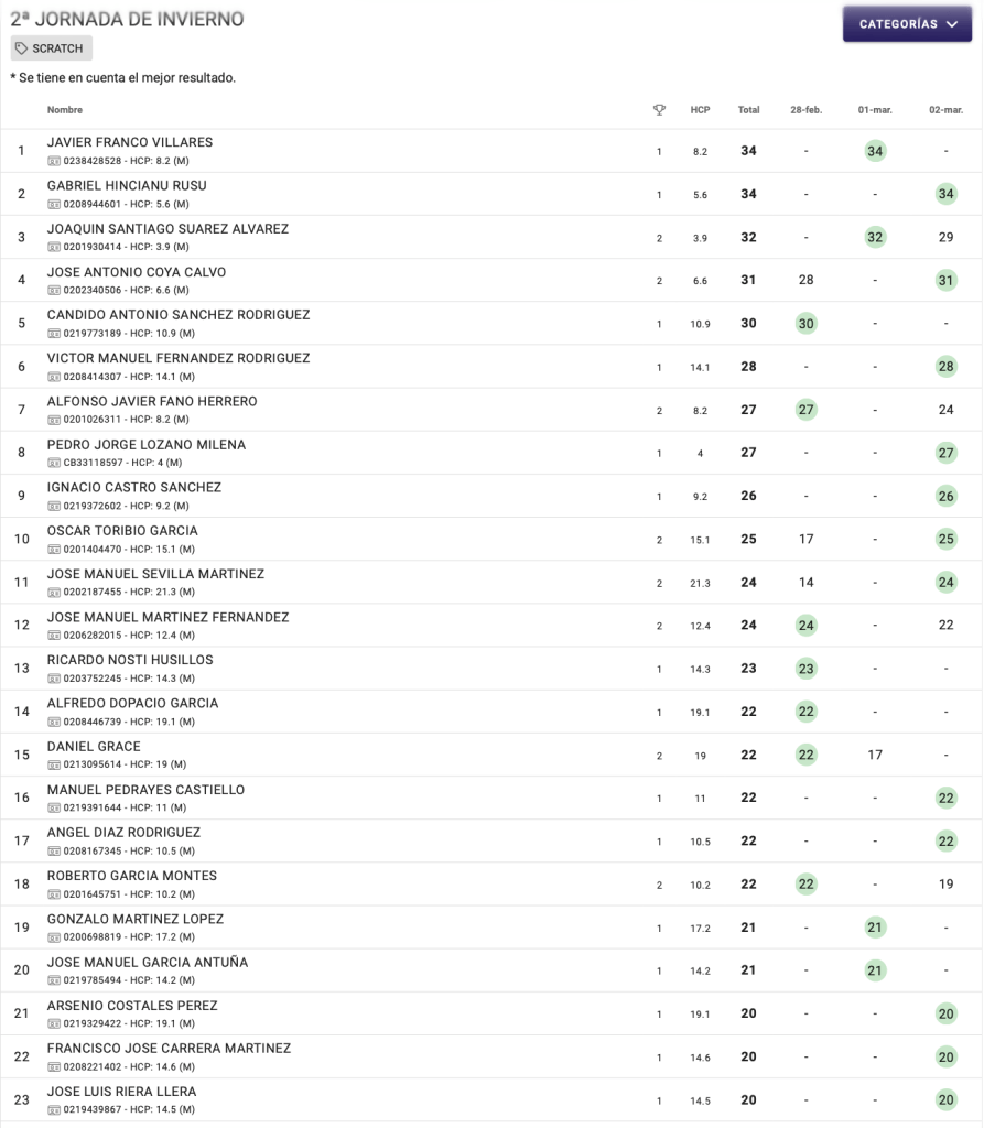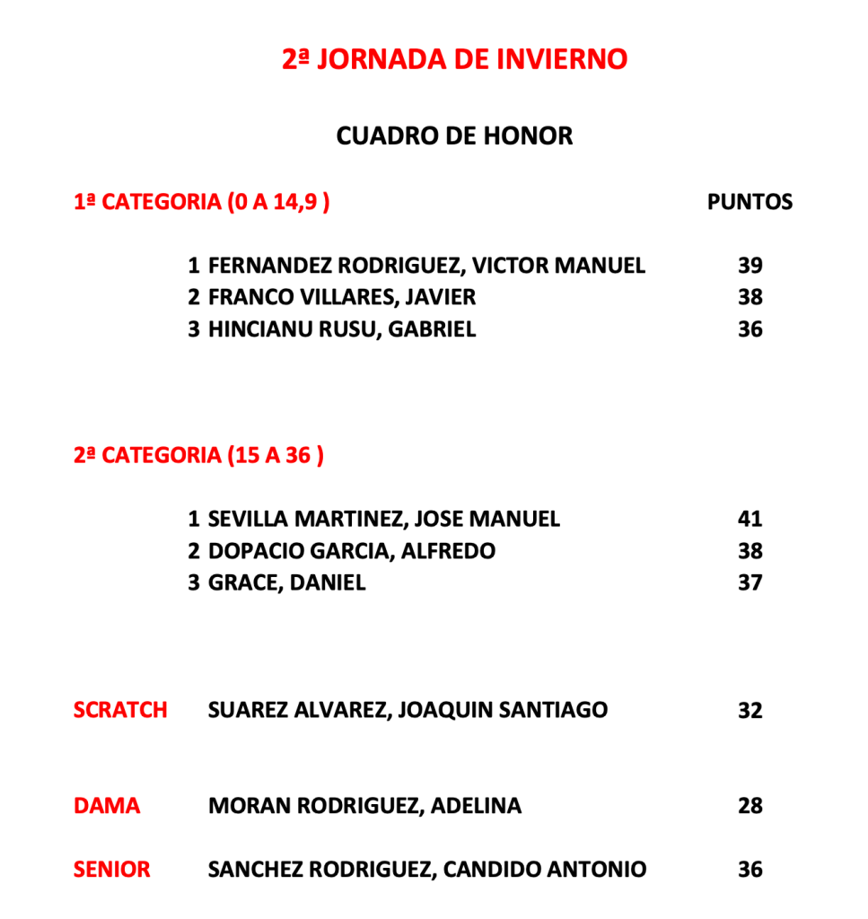 Resultados 2ª Jornadas Liga Invierno 2026 / Golf Course Villaviciosa