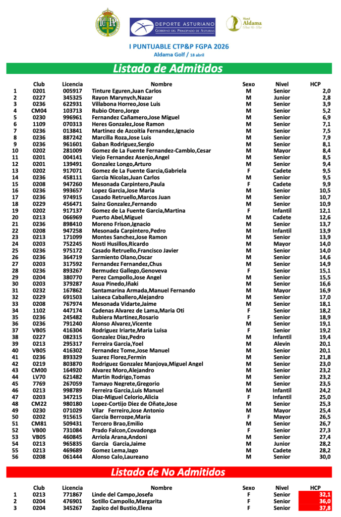 TORNEOS DE GOLF EN ASTURIAS Y LEON DEL 17 AL 19 DE ABRIL DE 2026