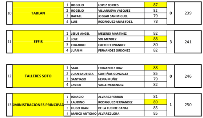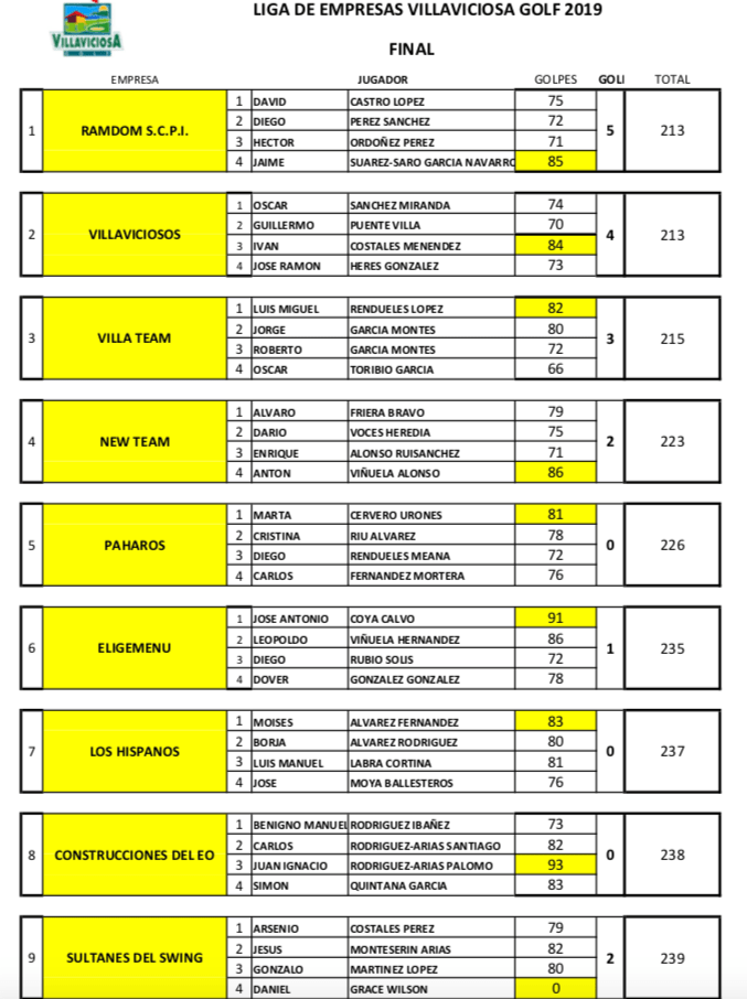 Después de muchos retrasos por el mal tiempo reinante durante Noviembre y Diciembre de 2019, hoy 12 de enero se pudo disputar la final de la LIGA DE EMPRESAS 2019, máxima tensión , ya que al terminar las partidas, para conocer el ganador se jugo en Play -Off, en el hoyo 1, entre RAMDOM y VILLAVICIOSOS.