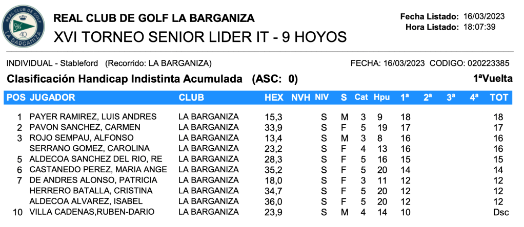 Resultados XVI Torneo Senior Líder IT / RCG BARGANIZA por Golf por Asturias en 16 marzo, 2023 CLASIFICACION 9 HOYOS CLASIFICACION 18 HOYOS Compártelo: Compartir en X (Se abre en una ventana nueva) X Comparte en Facebook (Se abre en una ventana nueva) Facebook Me gusta Cargando...