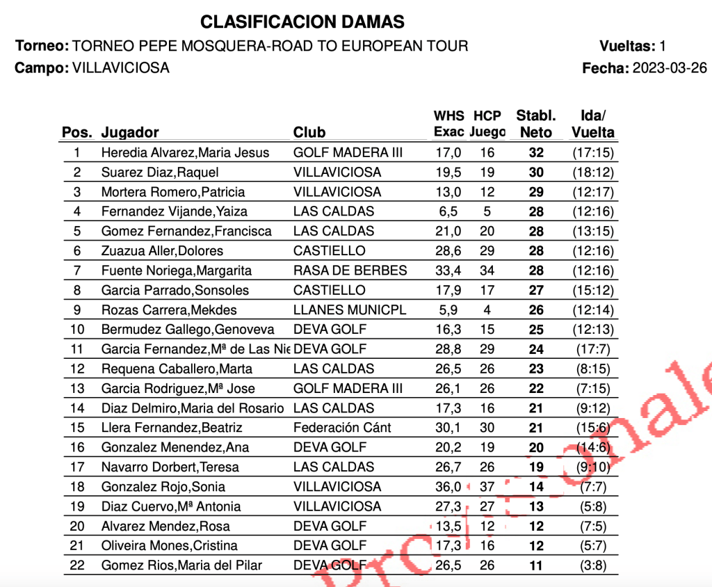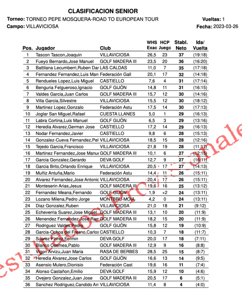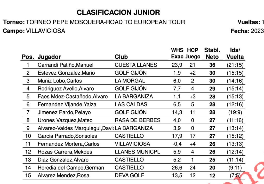 Resultados torneo «Pepin Mosquera Road To European Tour» – Villaviciosa Golf