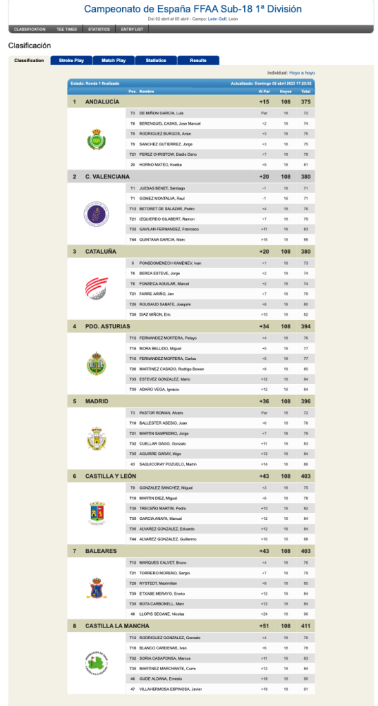 Después de celebrarse la primera jornada del campeonato de España Sub18 masculino, que se celebra en los 18 hoyos del club de golf León, nuestros representantes en la prueba terminan en cuarta posición de la 1ª división, mañana se enfrentaran al combinado madrileño en cuartos de final.