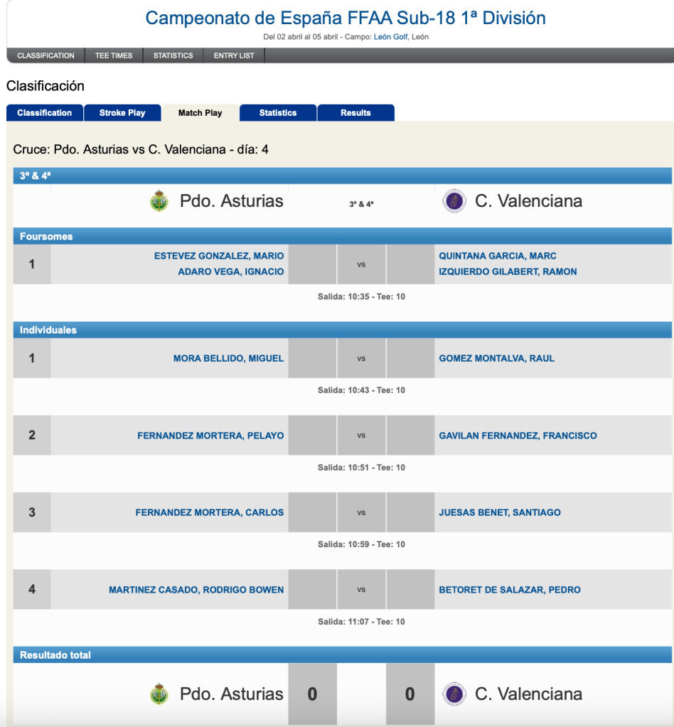 Mañana la unica partida Foursome lo juegan Mario Estevez e Ignacio Adaro, y cuatro individuales para Carlos y Pelayo Fdez. Mortera, Rodrigo Bowen Martinez y Miguel Mora Bellido.