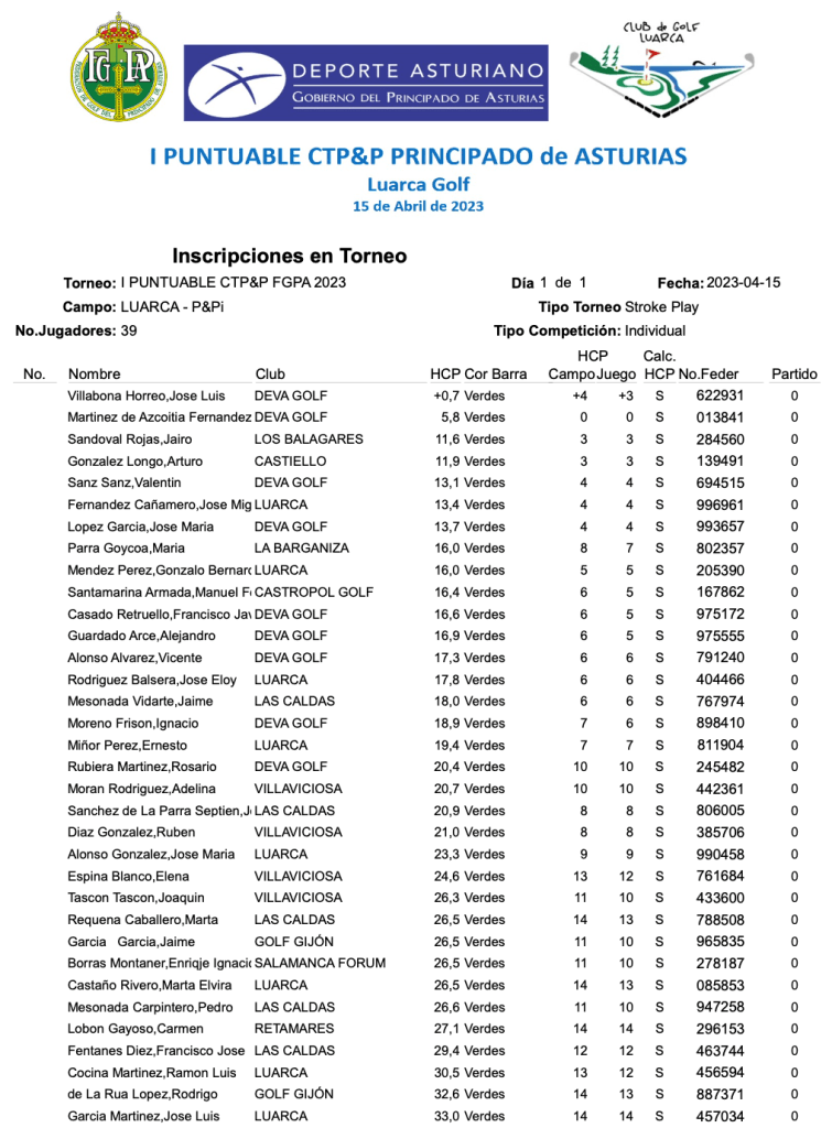 I Puntuable P&P 2023 ( Listado Provisional) / Luarca Golf