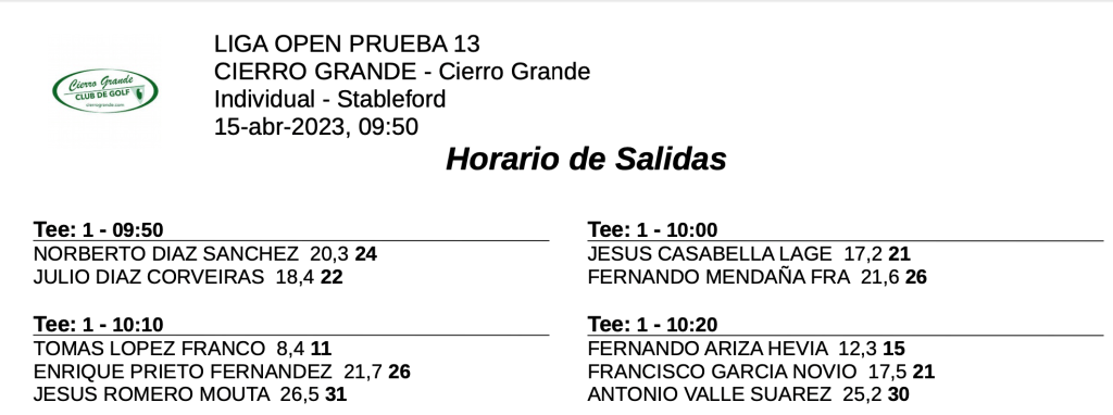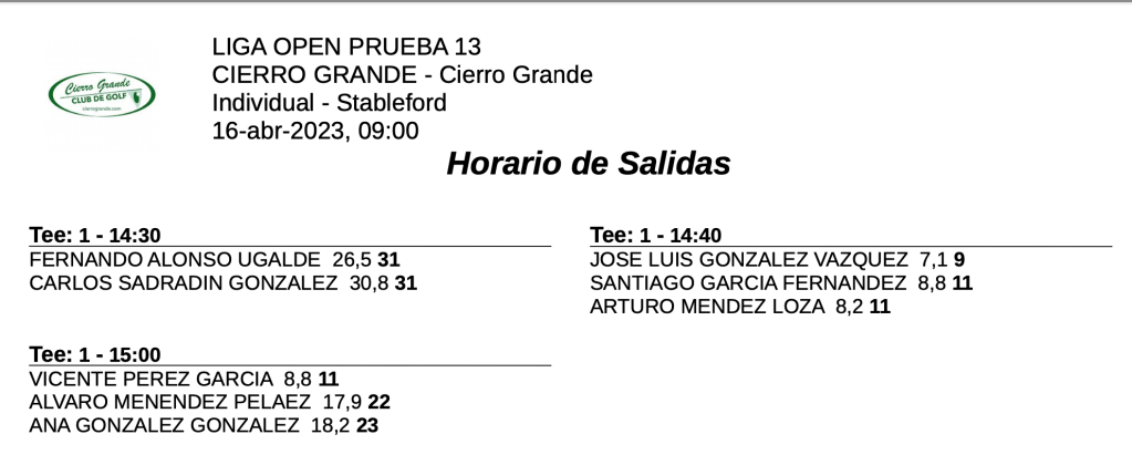 Salidas 13ª jornada LIGA OPEN / CIERRO GRANDE GOLF por Golf por Asturias en 15 abril, 2023 VIERNES SABADO Compártelo: Compartir en X (Se abre en una ventana nueva) X Comparte en Facebook (Se abre en una ventana nueva) Facebook Me gusta Cargando...