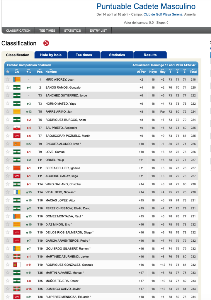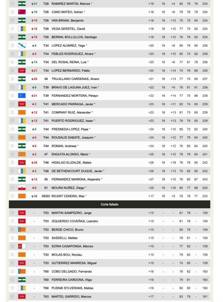 Después de tres jornadas y tras superar el corte de la segunda jornada, Pelayo Fdez. Mortera termina en el puesto trigésimo noveno del Campeonato Cadete Masculino.