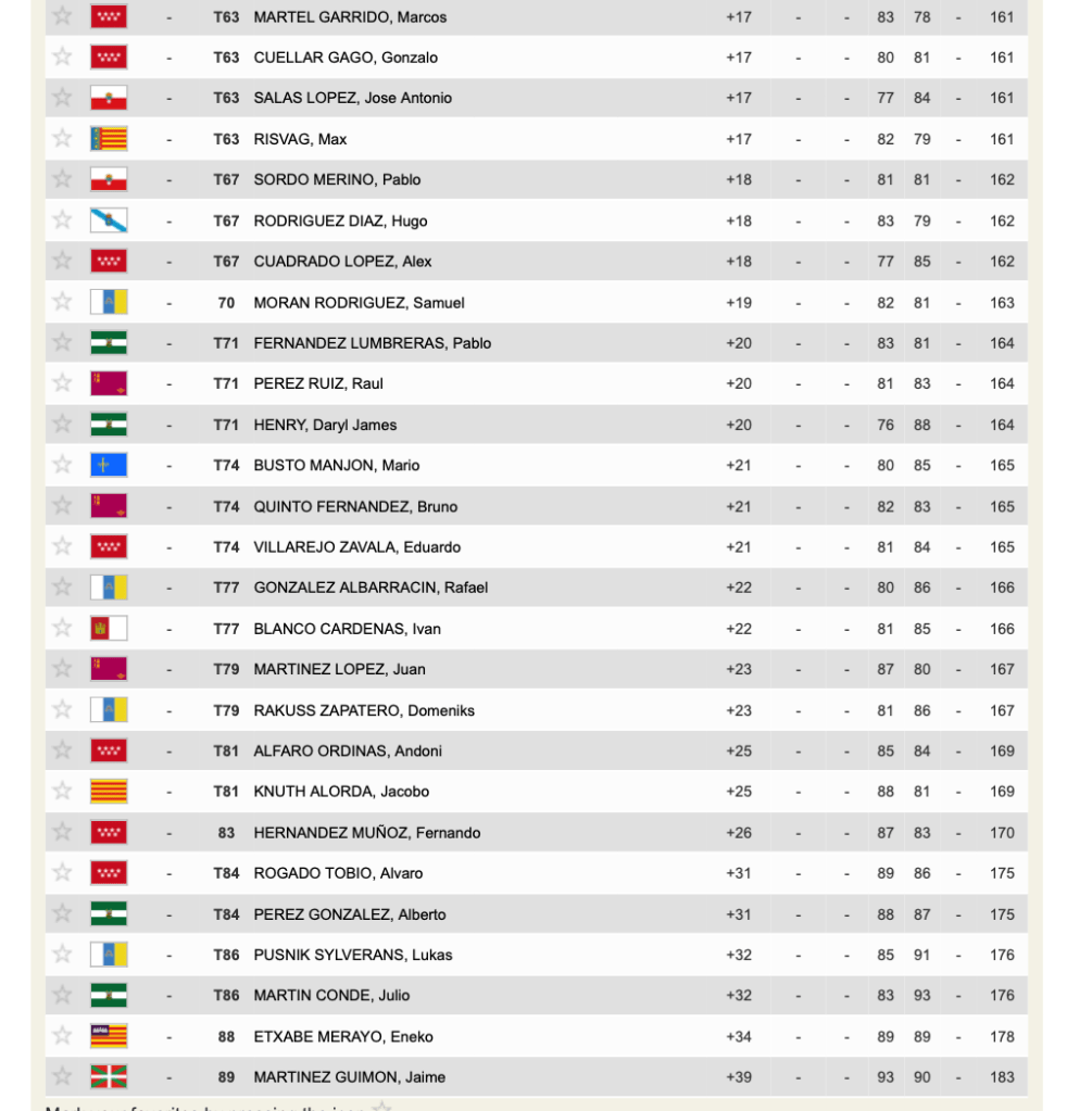 Peor suerte para el otro asturiano en la prueba Mario Busto Manjon, con tarjetas de 80 y 85 en las dos jornadas , 165 en total , cuando el corte quedo marcado en 158 golpes