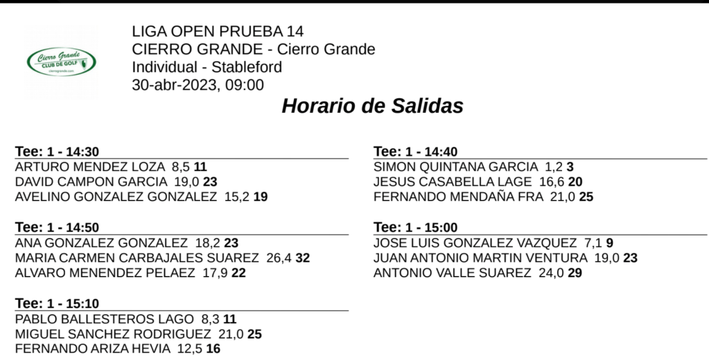 SALIDAS SABADO 14ª JORNADA LIGA OPEN / CIERRO GRANDE GOLF por Golf por Asturias en 29 abril, 2023 Compártelo: Compartir en X (Se abre en una ventana nueva) X Comparte en Facebook (Se abre en una ventana nueva) Facebook Me gusta Cargando...