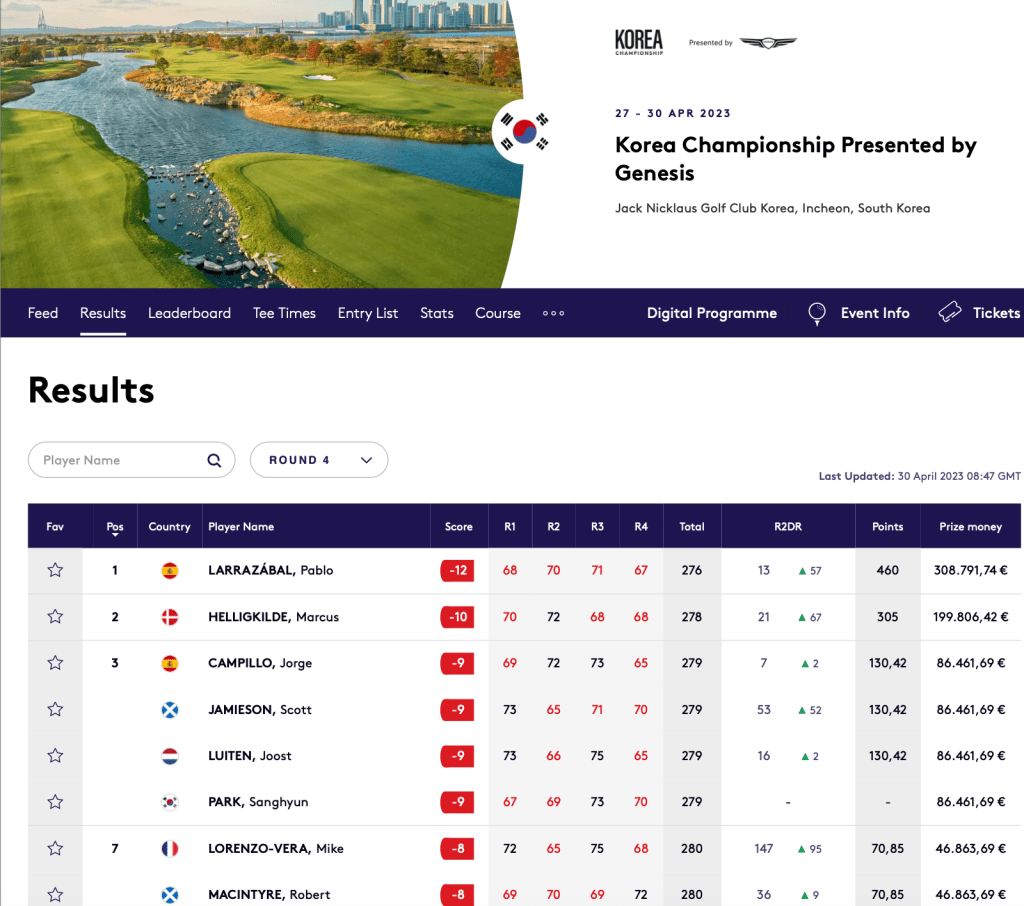 Pablo Larrazábal se impone en el Korea Championship dentro del circuito DP World Tour 2023, sumó 276 golpes en total, con parciales de 68, 70, 71 y 67, otro español se clasifico en el tercer puesto, Jorge Campillo acabo con tres golpes más que el ganador, 279 en total y tarjetas de 69,72,73 y una magnifica ultima vuelta de 65 golpes.
