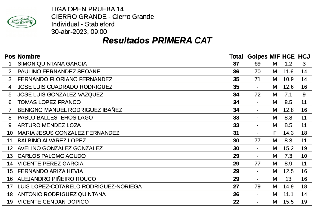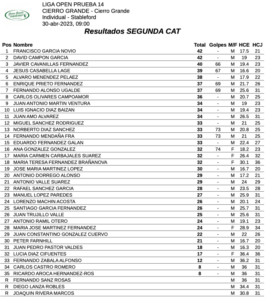 Resultados 14ª jornada LIGA OPEN 22/23 _ Cierro Grande Golf por Golf por Asturias en 1 mayo, 2023 CLASIFICACION 1ª CATEGORIA CLASIFICACION 2ª CATEGORIA Compártelo: Compartir en X (Se abre en una ventana nueva) X Comparte en Facebook (Se abre en una ventana nueva) Facebook Me gusta Cargando...