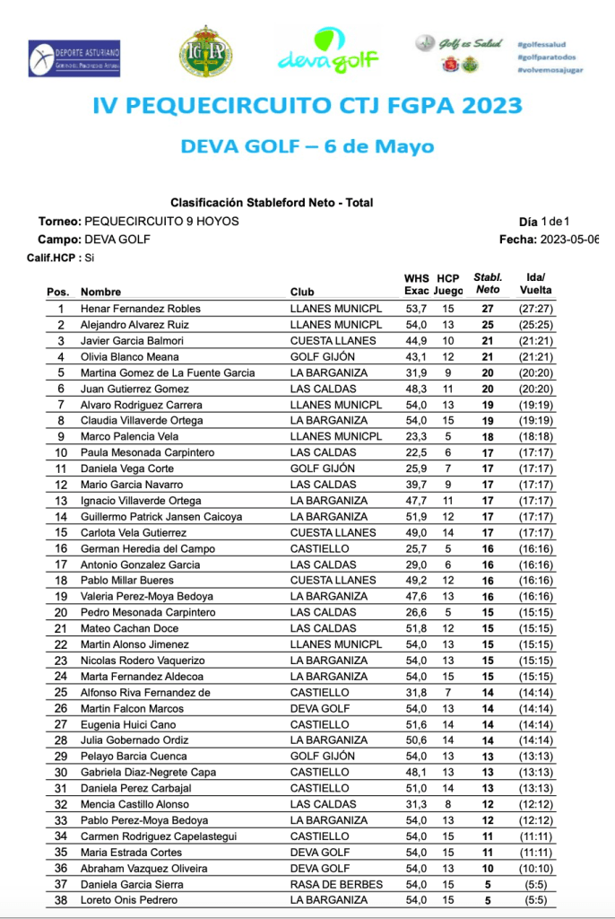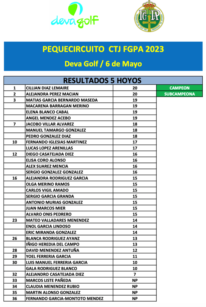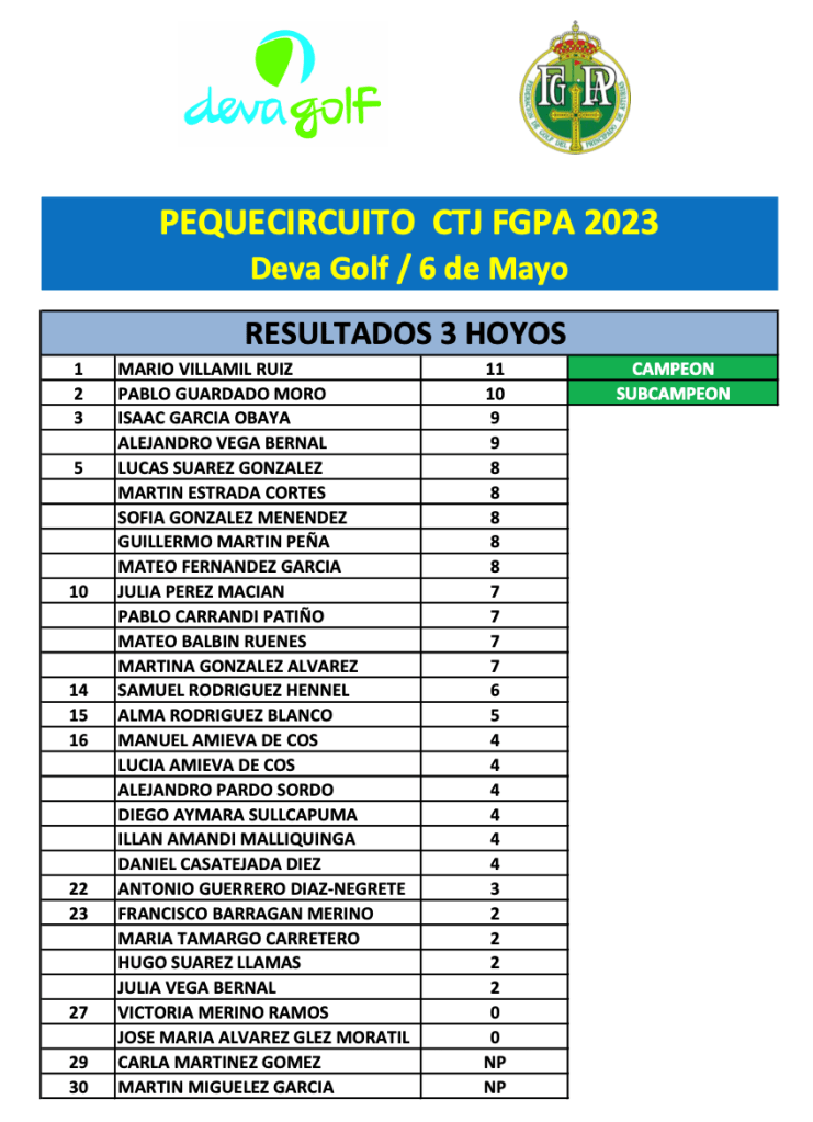 Resultados Prueba PEQUECIRCUITO 6 de Mayo 2023 / Deva Golf por Golf por Asturias en 6 mayo, 2023 CLASIFICACION 3 HOYOS CLASIFICACION 5 HOYOS CLASIFICACION 9 HOYOS foto FGPA Compártelo: Compartir en X (Se abre en una ventana nueva) X Comparte en Facebook (Se abre en una ventana nueva) Facebook Me gusta Cargando...