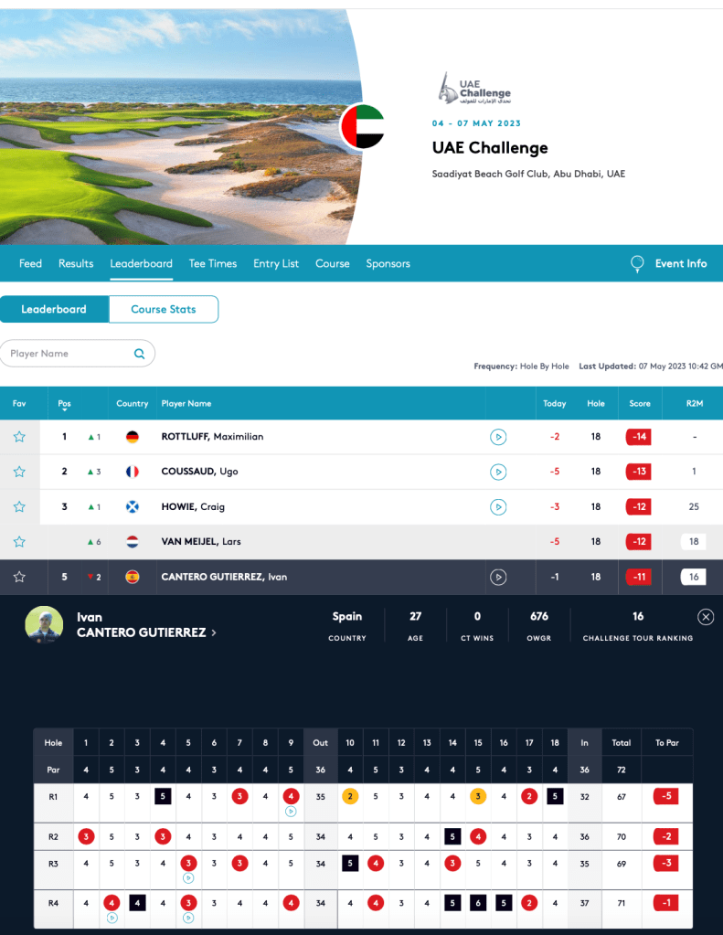 Después de cuatro jornadas de la nueva prueba del circuito Challenge Tour 2023, el Llanisco Ivan Cantero finaliza en el quinto puesto, desde la primera jornada donde termino en primera plaza, , nunca bajo del Top 5 , la segunda jornada fue segundo, para la ultima jornada salía en la partida estelar, junto a Manuel Elvira.