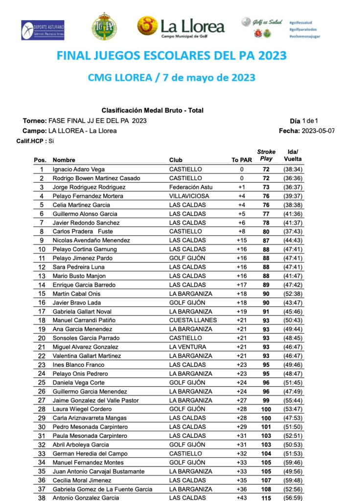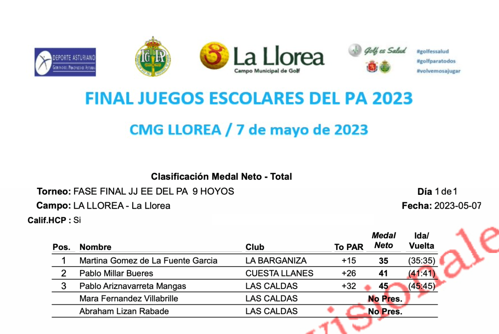 Resultados Final JJ EE del PA 2023/ C.M. GOLF LA LLOREA por Golf por Asturias en 9 mayo, 2023 El pasado fin de semana se celebró la final de JJ EE del Principado de Asturias en la modalidad Golf, con los siguientes resultados según categorías. CATEGORIA 9 HOYOS CATEGORIA 18 HOYOS Compártelo: Compartir en X (Se abre en una ventana nueva) X Comparte en Facebook (Se abre en una ventana nueva) Facebook Me gusta Cargando...