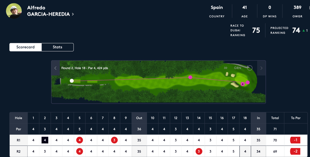 Alfredo realizar sus dos primeras vueltas con tarjetas de 70 y 69 golpes, suma 139 en total , cuando el corte se situó en 140 golpes, dos jornadas por delante para el asturiano para mejorar en la clasificación de la nueva prueba del DP World Tour 2023.