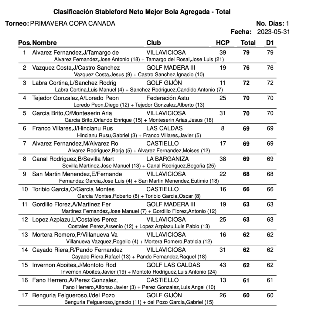 RESULTADOS TORNEO PRIMAVERA PAREJAS – COPA CANADA / 31 MAYO 23 / VILLAVICIOSA GOLF por Golf por Asturias en 2 junio, 2023 Compártelo: Haz clic para compartir en X (Se abre en una ventana nueva) X Haz clic para compartir en Facebook (Se abre en una ventana nueva) Facebook Me gusta Cargando...