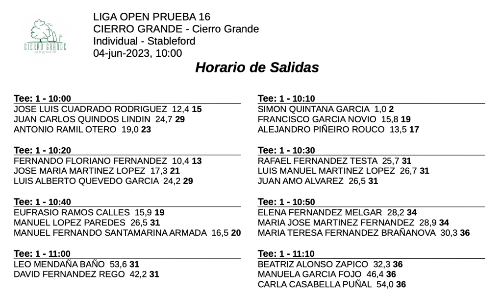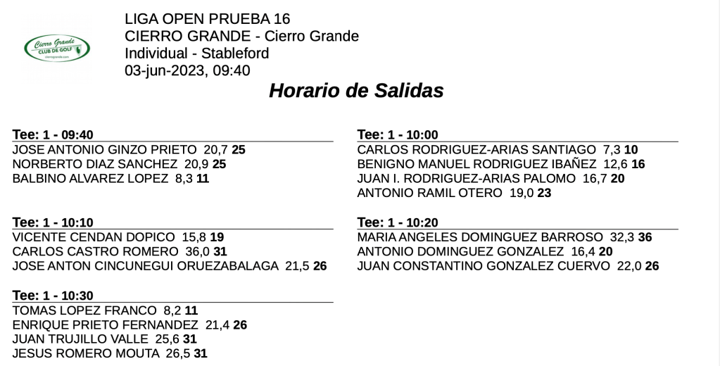 Horarios salidas sábado y domingo 16ª jornada LIGA OPEN / Cierro Grande Golf por Golf por Asturias en 4 junio, 2023 SABADO DOMINGO Compártelo: Haz clic para compartir en X (Se abre en una ventana nueva) X Haz clic para compartir en Facebook (Se abre en una ventana nueva) Facebook Me gusta Cargando...
