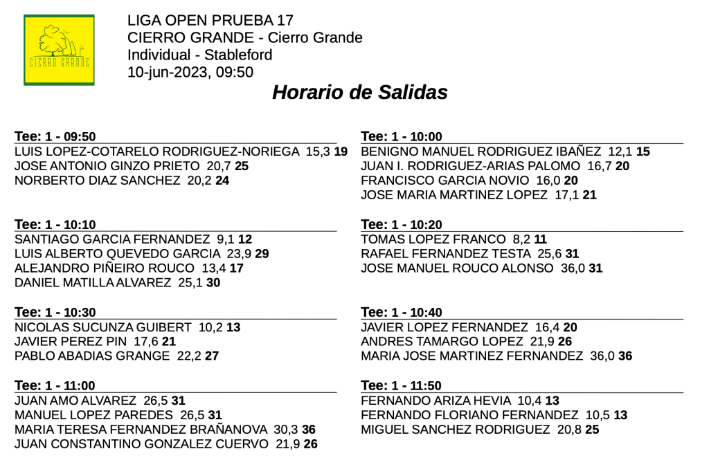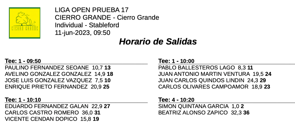 Horarios salidas sábado y domingo 17ª jornada LIGA OPEN / CIERRO GRANDE GOLF por Golf por Asturias en 11 junio, 2023 SABADO DOMINGO Compártelo: Compartir en X (Se abre en una ventana nueva) X Comparte en Facebook (Se abre en una ventana nueva) Facebook Me gusta Cargando...