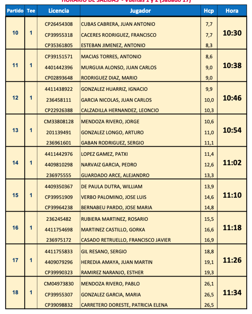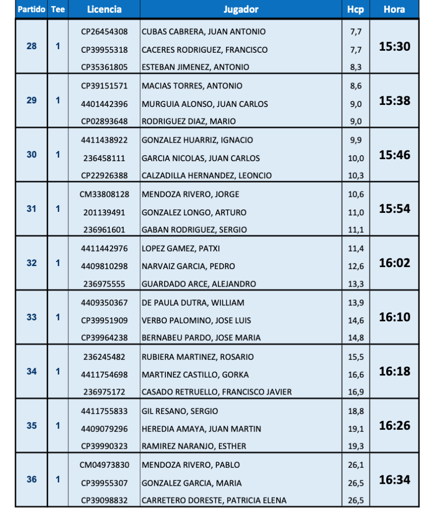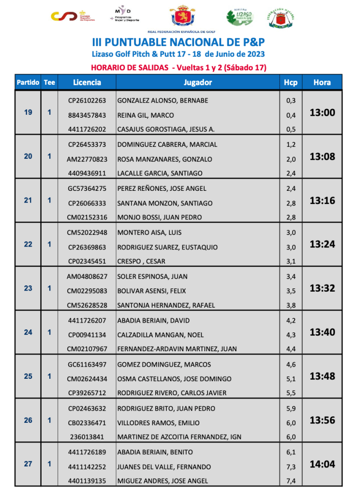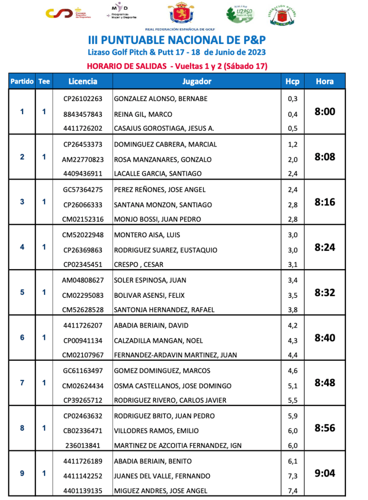 HORARIOS DE SALIDA III PUNTUABLE NACIONAL DE P&P 2023 ( 1ª Y 2ª VUELTA 1ª JORNADA) / Lizaso Golf Pitch & Putt por Golf por Asturias en 17 junio, 2023 1ª VUELTA 2ª VUELTA Compártelo: Compartir en X (Se abre en una ventana nueva) X Comparte en Facebook (Se abre en una ventana nueva) Facebook Me gusta Cargando...