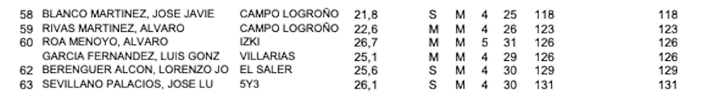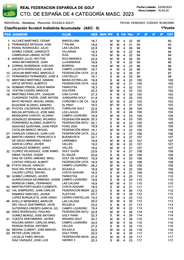Julio Rosal es nuestro mejor representante en la prueba, tras la primera jornada y 94 golpes, se sitúa en el tercer puesto, a tan solo cuatro golpes del líder. Jose A. Fernandez, en el puesto 11º con un total de 99 golpes, Alberto Fernandez ocupa el puesto 23º , suma en su vuelta 105 golpes, Jose Ramon Florez termina su vuelta con 108 golpes, puesto 32º, 110 golpes necesito Fernando Noriega para terminar la jornada y situarse 39º, 113 para Marcos Avello, lo que le sitúa 46º, 114 para Paulino Suarez en el 49º