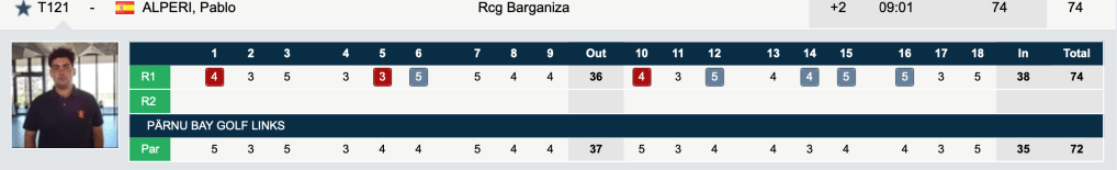 El asturiano Pablo Alperi, realiza su primera vuelta del European Amateur Championship Masculino con un +2 del Par del campo, se sitúa en el puesto 121º, sus nueve primeros hoyos los realiza con uno bajo Par, pero en la segunda parte del campo un solo Birdie y cuatro Bogey,.