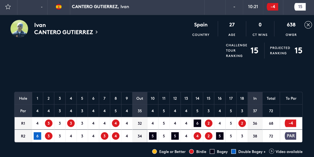 Ivan Cantero supera el corte de la nueva prueba del Challenge Tour2023, que continua su viaje por tierras francesas, el profesional llanisco entrega una tarjeta de Par del campo en esta segunda ronda, se sitúa en el puesto vigésimo primero y le permite superar el corte del viernes.