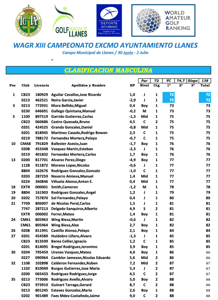 Arranco ayer viernes 30 de junio una nueva edición del torneo del Excmo. Ayuntamiento de Llanes, prueba valedera para el WAGR, la primera partida estaba compuesta por tres jugadores asturianos Diego Alvarez, Javier Neira y Esteban Vazquez, después de esta primera ronda , tan solo Javier Neira esta en cabeza de la clasificación con el catalán Jose Ricardo Aguilar, ambos con el Par del campo, muy cerca de ellos, con un golpes más, puros dos asturianos, el Gijones Miguel Mora Bellido y el valdesano Manuel Gallego Quintana con +1, con 75 golpes, Daniel Granda, Rodrigo Bowen y Pelayo Fdez. Mortera en quinta posición.