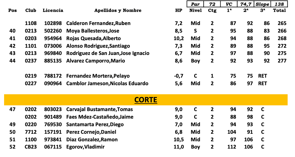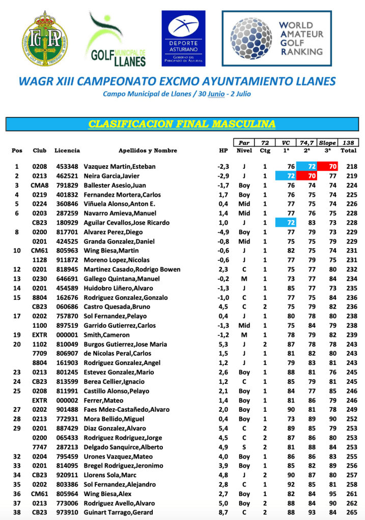 Cuarto fue Carlos Fdez. Mortera, con parciales de 76, 75 y 74, Antón Viñuela finaliza quinto, sexto puesto para Manuel Navarro y Jose Ricardo Aguilar, en octavo lugar, los asturianos Diego Alvarez y Daniel Granda, completa en Top Ten Martin Wing y Nicolas Moreno