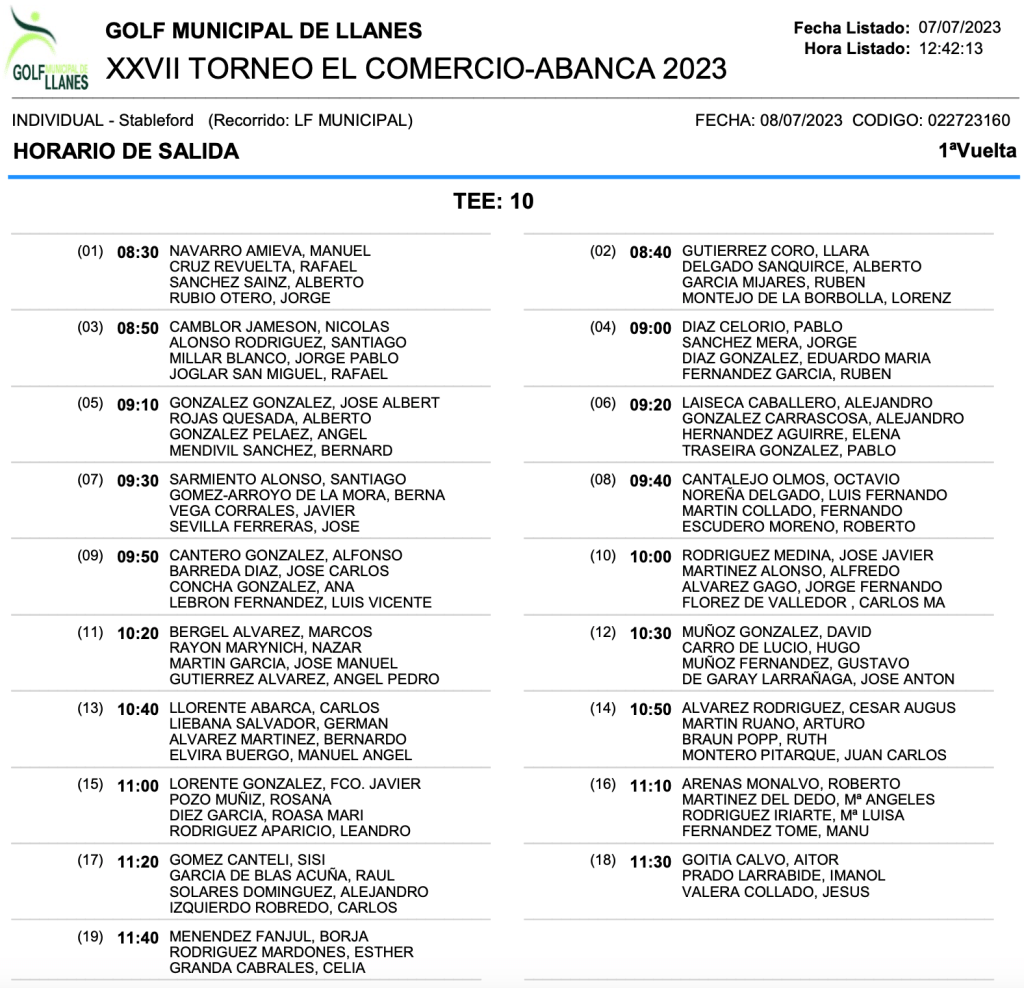 HORARIOS SALIDA XXVII TORNEO EL COMERCIO-ABANCA 2023/ C.M. GOLF LLANES por Golf por Asturias en 8 julio, 2023 Compártelo: Compartir en X (Se abre en una ventana nueva) X Comparte en Facebook (Se abre en una ventana nueva) Facebook Me gusta Cargando...