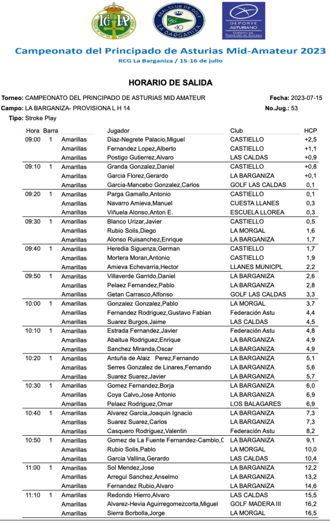 Campeonato del PA Mid Amateur 2023/ RC Golf La Barganiza por Golf por Asturias en 14 julio, 2023 HORARIO SALIDAS 1ª JORNADA Compártelo: Compartir en X (Se abre en una ventana nueva) X Comparte en Facebook (Se abre en una ventana nueva) Facebook Me gusta Cargando...