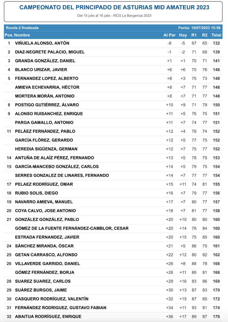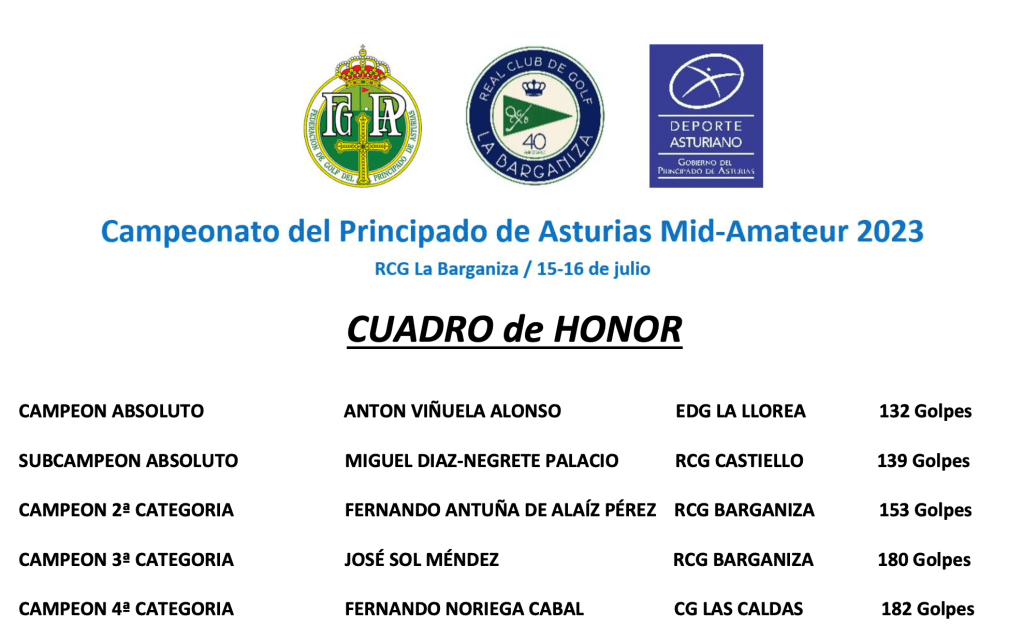 Anton Viñuela gana el campeonato Mid-Amateur del Principado de Asturias 2023 con un total de 132 golpes, parciales de 67 y 65 , (-8)