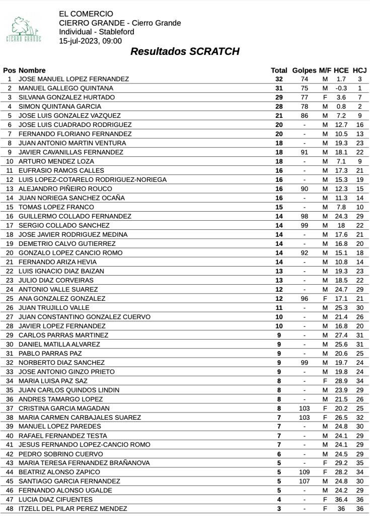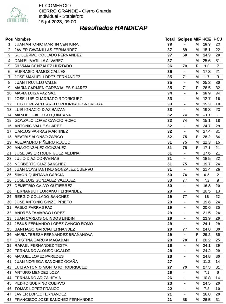 Resultados trofeo el Comercio 2023 / Cierro Grande Golf