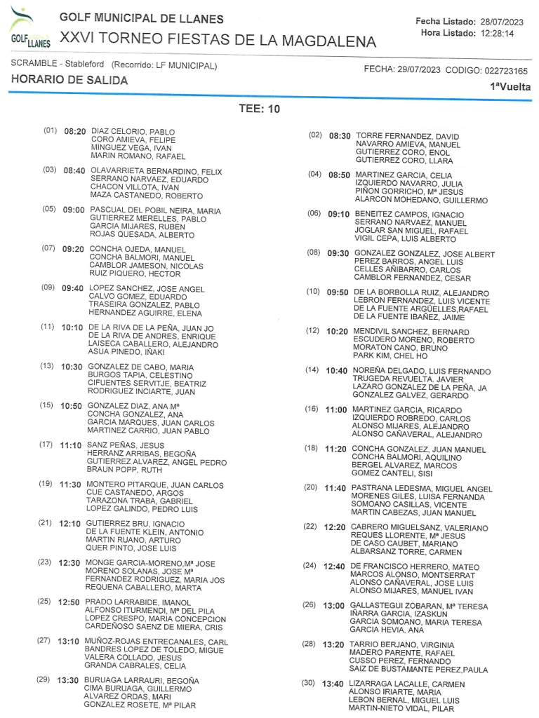 Horarios salidas Torneo la Magdalena 2023 / C.M. Golf Llanes por Golf por Asturias en 29 julio, 2023 SALIDAS SABADO Compártelo: Haz clic para compartir en X (Se abre en una ventana nueva) X Haz clic para compartir en Facebook (Se abre en una ventana nueva) Facebook Me gusta Cargando...