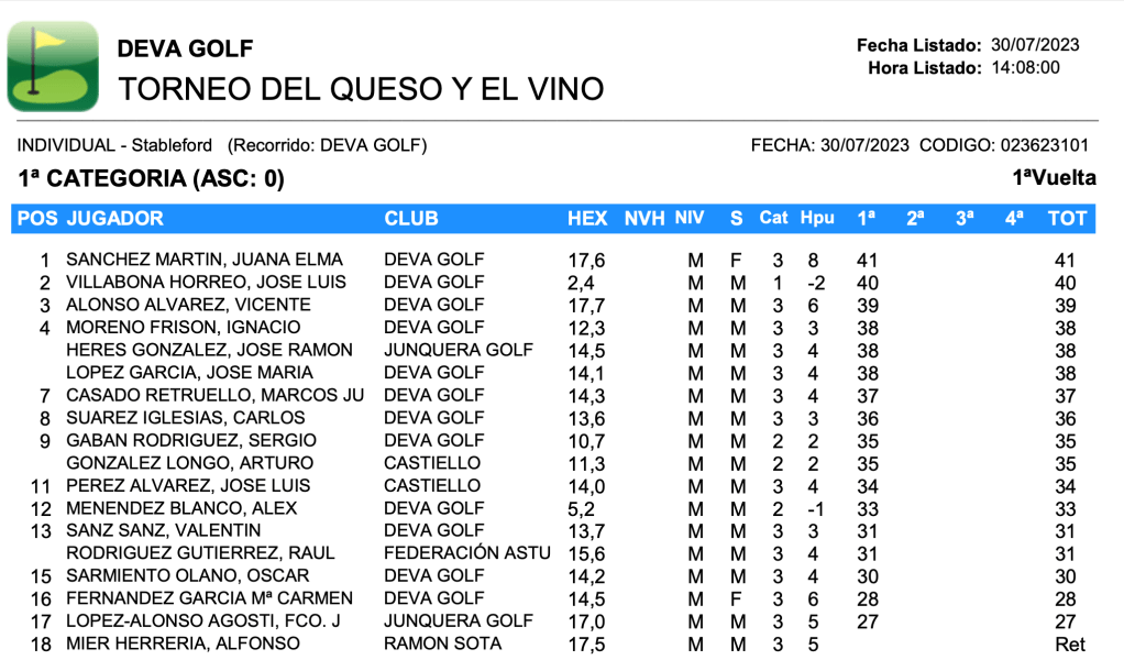 Resultados Torneo Queso y Vino / Deva Golf por Golf por Asturias en 31 julio, 2023 CUADRO HONOR CLASIFICACION 1ª CATEGORIA CLASIFICACION 2ª CATEGORIA Compártelo: Haz clic para compartir en X (Se abre en una ventana nueva) X Haz clic para compartir en Facebook (Se abre en una ventana nueva) Facebook Me gusta Cargando...