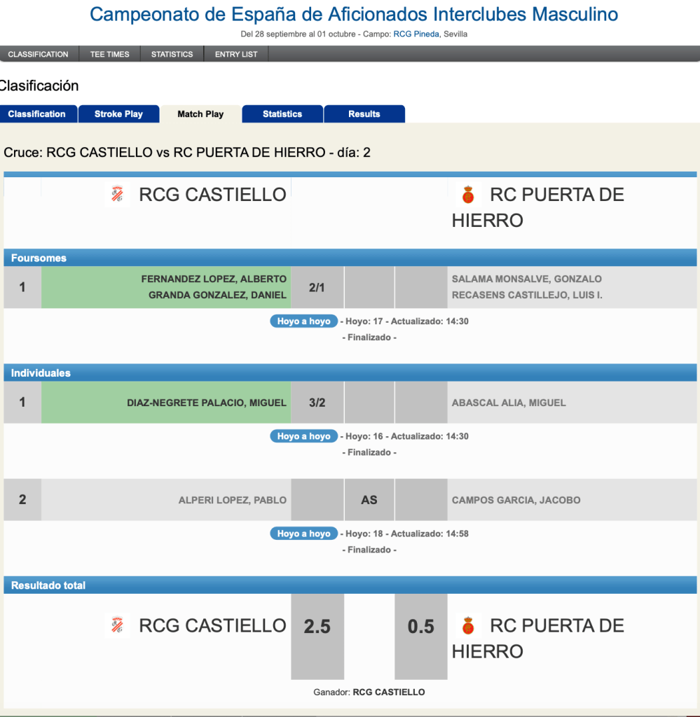 RCG CASTIELLO A SEMIFINALES DEL INTERCLUBES MASCULINO 2023 por Golf por Asturias en 30 septiembre, 2023 Tras ganar en semifinales por un tanteo de 2,5 a 0,5 al combinado del RC Puerta de Hierro, el equipo del RCG de Castiello se mide en semifinales al conjunto del RCG de Manises foto FGPA Compártelo: Haz clic para compartir en X (Se abre en una ventana nueva) X Haz clic para compartir en Facebook (Se abre en una ventana nueva) Facebook Me gusta Cargando...