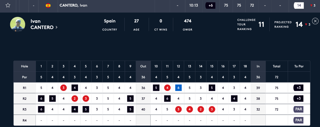 Ivan Cantero finaliza su ronda con el PAR del campo, cuatro Birdie y cuatro Bogei marcan su vuelta, suma + 6 del campo, su situación actual le lleva al puesto 14º del ranking