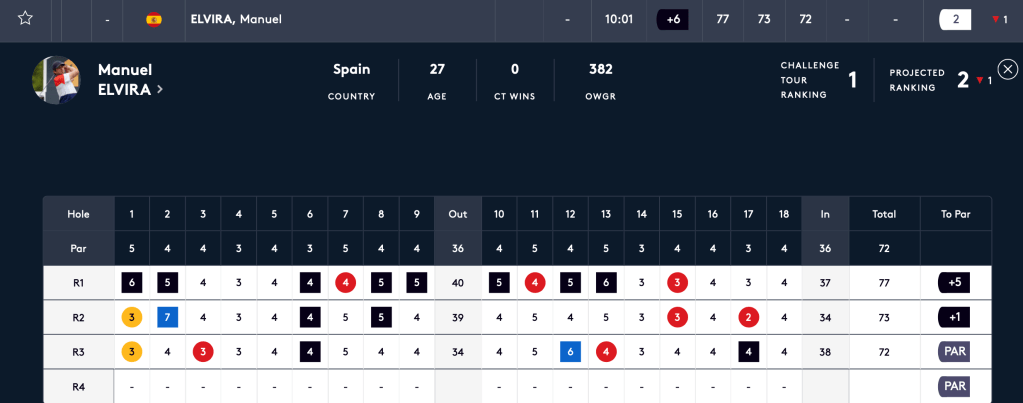 Manuel Elvira, se encuentra en la misma posición que el llanisco Ivan Cantero, puesto vigésimo, destacar el Eagle en el hoyo uno, finaliza con el Par del campo , suma total de +6