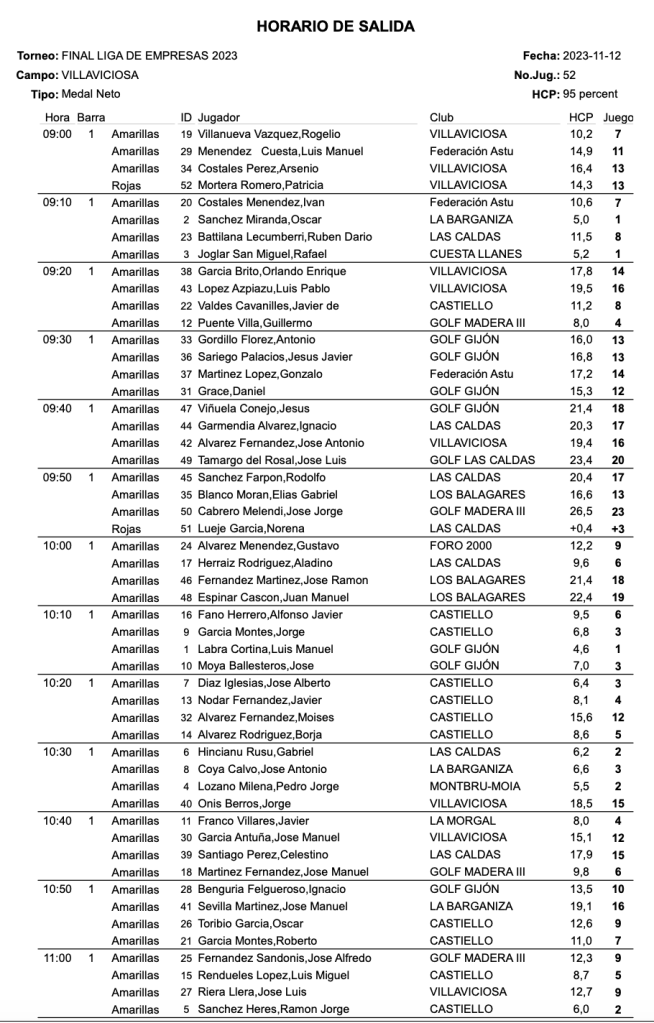 SALIDAS FINAL TORNEO EMPRESAS 2023 / VILLAVICIOSA GOLF por Golf por Asturias en 10 noviembre, 2023 El próximo domingo 12 de noviembre, se celebra en el Club de Golf de Villaviciosa, la final de la Liga de Empresas 2023, con los siguientes horarios. Compártelo: Compartir en X (Se abre en una ventana nueva) X Comparte en Facebook (Se abre en una ventana nueva) Facebook Me gusta Cargando...