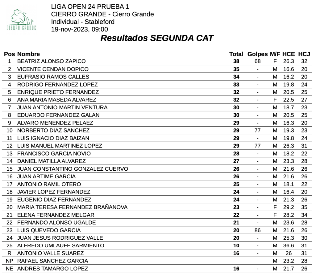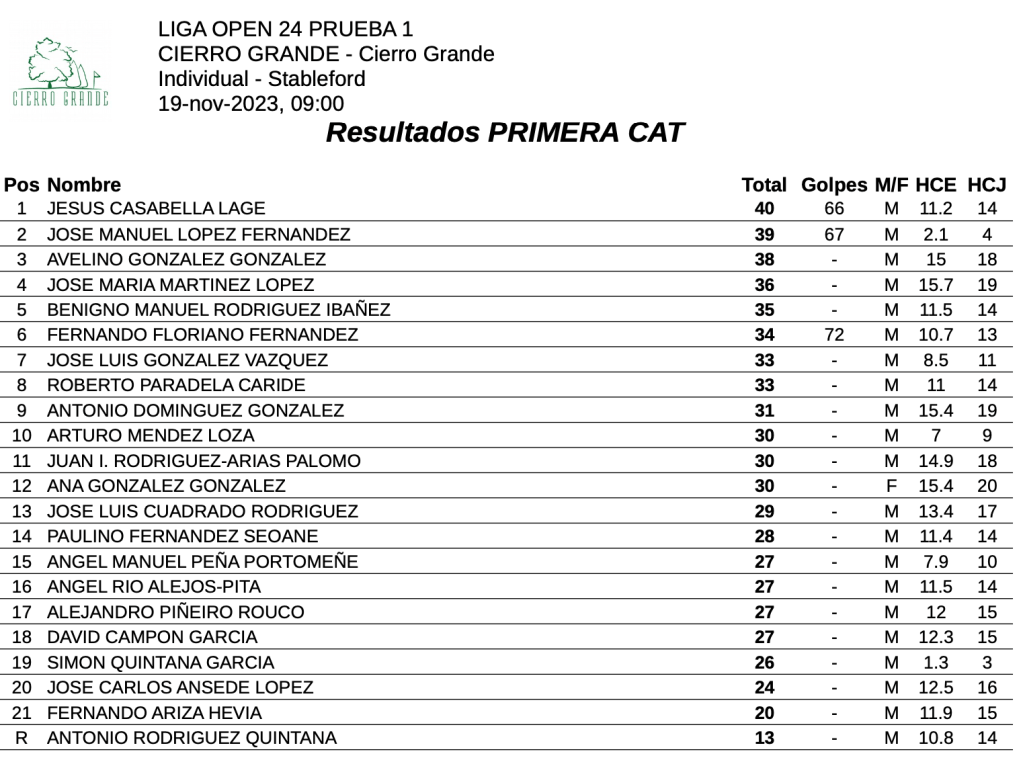Resultados 1ª jornada LIGA OPEN 23/24 – Cierro Grande Golf por Golf por Asturias en 20 noviembre, 2023 CLASIFICACION 1ª CATEGORIA CLASIFICACION 2ª CATEGORIA Compártelo: Compartir en X (Se abre en una ventana nueva) X Comparte en Facebook (Se abre en una ventana nueva) Facebook Me gusta Cargando...