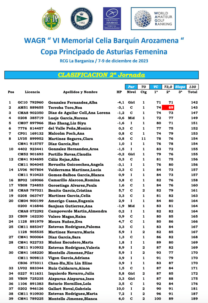 Segunda clasificada, a tan solo un golpe de la líder, Noa Terroba Toro, suma 143, con parciales de 74 y 69 golpes, única jugadora bajo el Par del campo en su segunda vuelta.