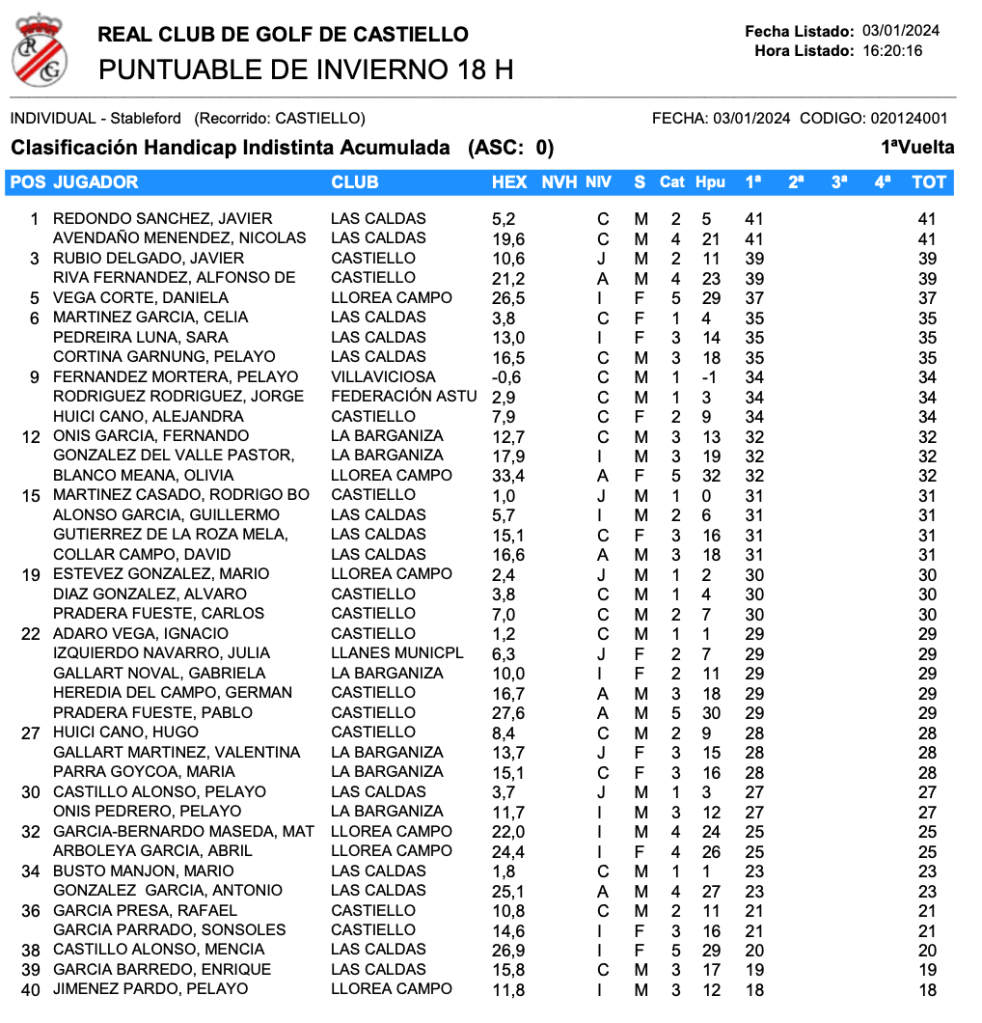 Javier Redondo Sánchez (CG Las Caldas), con 36 puntos Stableford Scratch, ha sido el mejor en la Prueba Puntuable Invierno CTJ FGPA que se celebró hoy en el RCG Castiello, con 1 punto de ventaja sobre Pelayo Fernández Mortera (Villaviciosa Golf), segundo con 35 puntos.