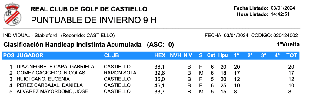 En la competición reservada a benjamines, los mejores han sido Nicolás Gómez Cacicedo (Ramón Sota) con 3 puntos Stableford Scratch, con Gabriela Díaz-Negrete Capa (RCG Castiello) y Eugenia Huici Cano (RCG Castiello), segundas con 2 puntos.