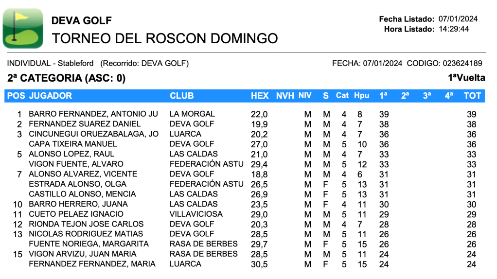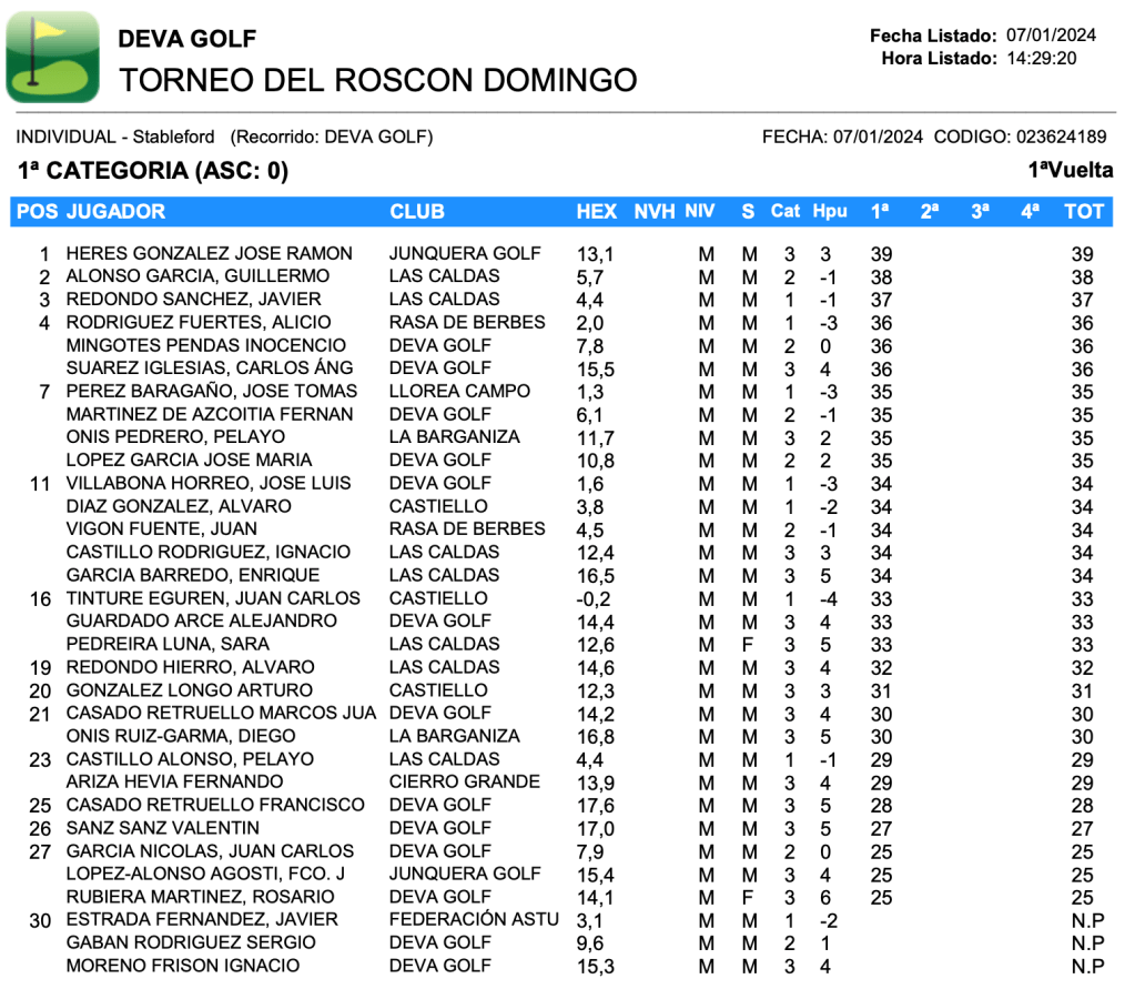 Resultados Torneo Roscon de Reyes 2024 / Deva Golf por Golf por Asturias en 8 enero, 2024 CUADRO DE HONOR CLASIFICACION 1ª CATEGORIA CLASIFICACION 2ª CATEGORIA Compártelo: Compartir en X (Se abre en una ventana nueva) X Comparte en Facebook (Se abre en una ventana nueva) Facebook Me gusta Cargando...