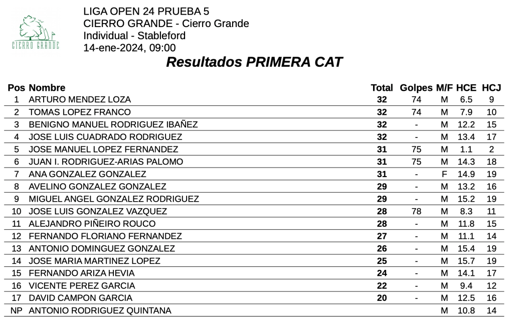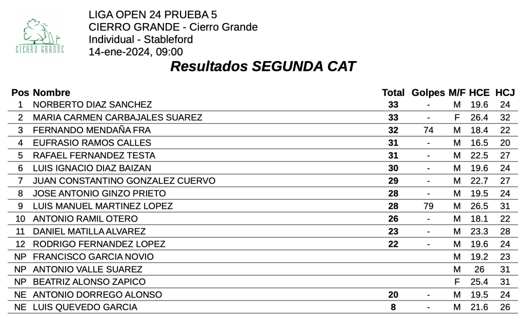 Resultados 5ª jornada Liga OPEN 23/24 – Cierro Grande Golf por Golf por Asturias en 15 enero, 2024 Se celebró una nueva jornada de la Liga OPEN 23/24 en Cierro Grande Golf, con los siguientes resultados en 1ª y 2ª categoria 1ª CATEGORIA 2ª CATEGORIA Compártelo: Compartir en X (Se abre en una ventana nueva) X Comparte en Facebook (Se abre en una ventana nueva) Facebook Me gusta Cargando...