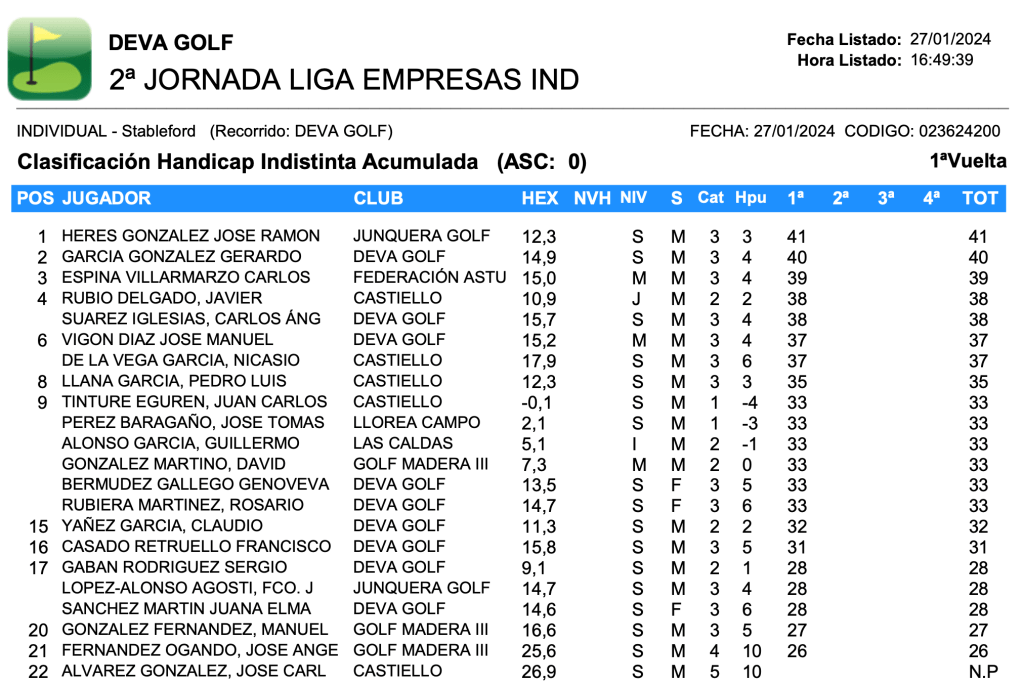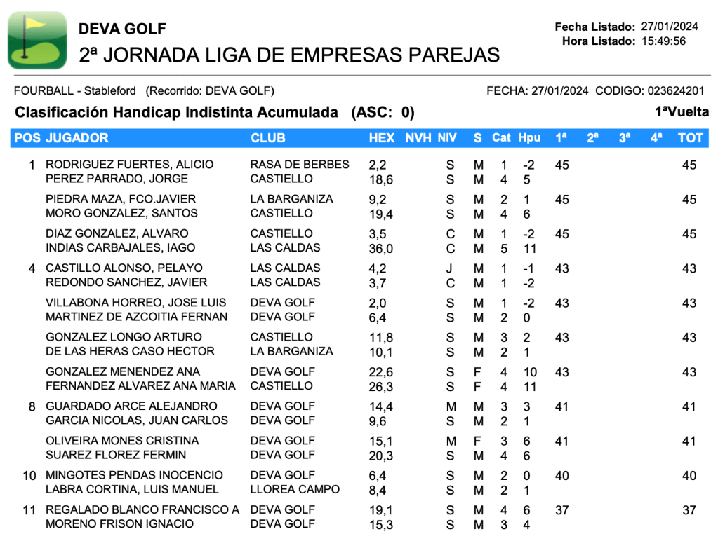 Resultados 2º jornada Liga de Empresas 2024 / Deva Golf por Golf por Asturias en 28 enero, 2024 CLASIFICACION HANDICAP CLASIFICACION PAREJAS FOURBALL Compártelo: Compartir en X (Se abre en una ventana nueva) X Comparte en Facebook (Se abre en una ventana nueva) Facebook Me gusta Cargando...