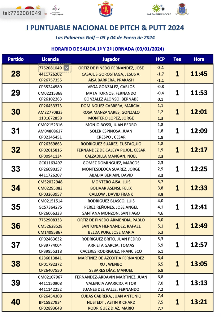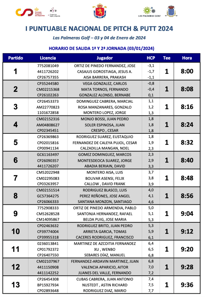 Estos son los horarios de salida de la 1ª y 2ª jornada del I puntuable nacional de P&P 2024, prueba que se realiza en los 18 hoyos del club Las Palmeras ( Las palmas de GC)