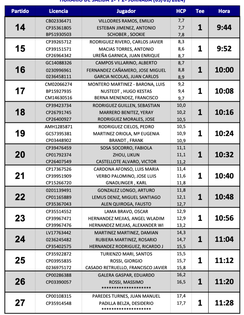 HORARIOS SALIDAS 1ª Y 2ª JORNADA I PUNTUABLE NACIONAL P&P 2024 / LAS PALMERAS GOLF