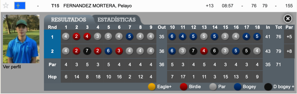 Pelayo esta cerca del Top ten de la prueba, suma 155 golpes en total, con tarjetas 76 y 79, ocupa el puesto decimo quinto para esta ultima jornada.